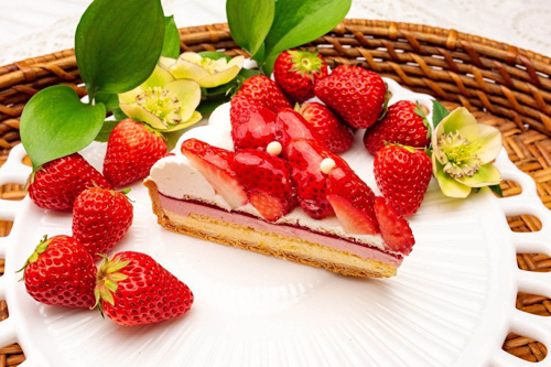 今が旬のイチゴをメインに、爽やかなオレンジムースを合わせた春らしくフレッシュな味わいのタルトです。パリパリのホワイトチョコレートに、オレンジとイチゴ、2種類のムースを重ね、イチゴ&ラズベリーのジャムが甘酸っぱいアクセントをプラスしてくれます。