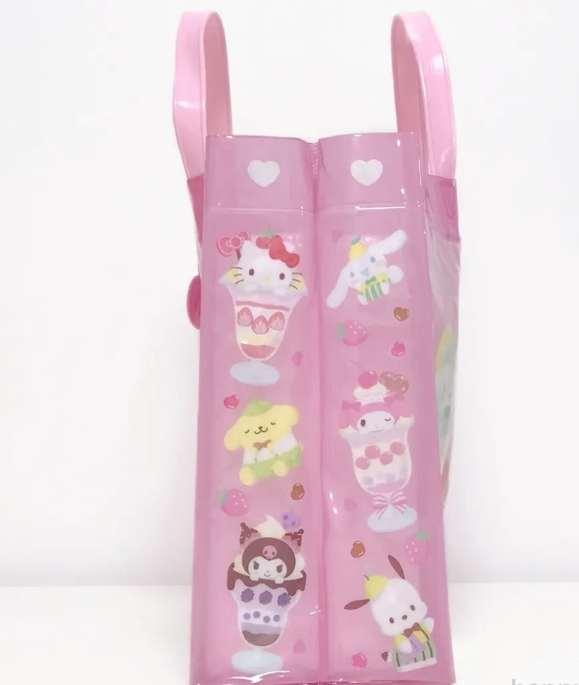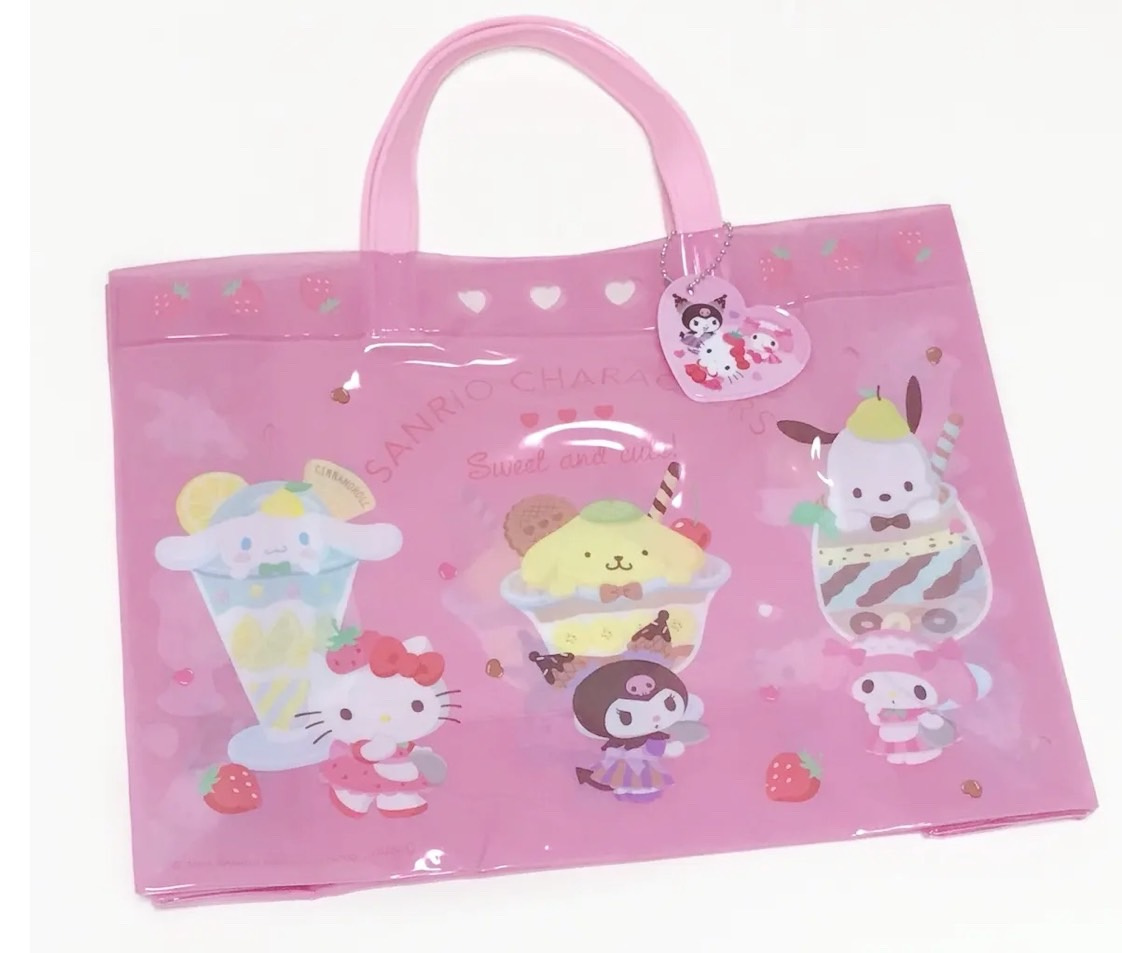 かわいいサンリオキャラクターズデザインの角型ビーチバッグ。女の子に人気のピンクカラー。ほどよい透け感で中身が見えにくいのも嬉しいポイントですねо(ж>▽<)y ☆