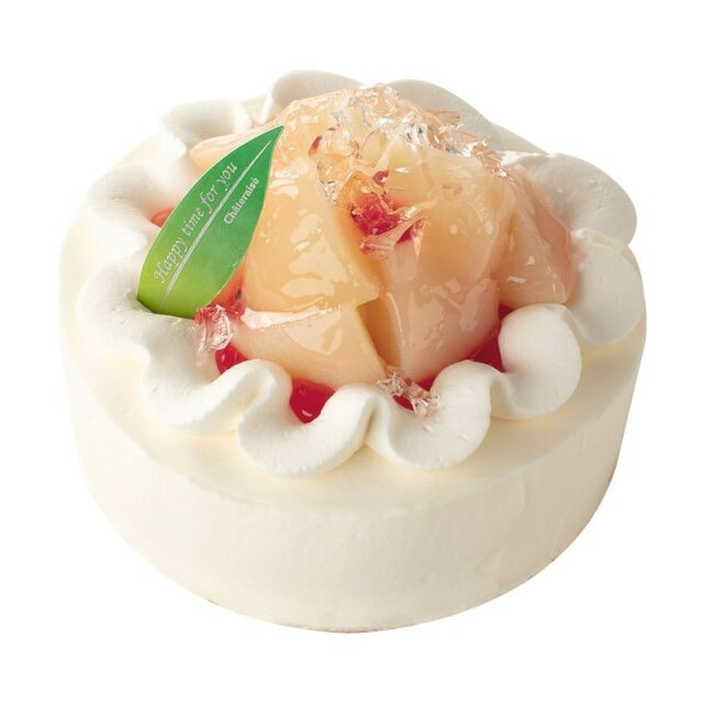 こちらはシャトレーゼの「8月限定山梨県のデコレーション14㎝」。夏にぴったりな白桃を主役にしてケーキです。