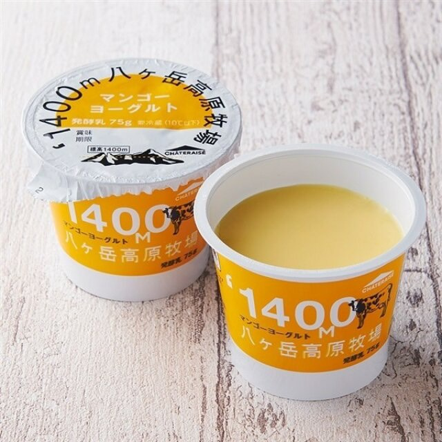 八ヶ岳の契約牧場から届くしぼりたての牛乳を使用したヨーグルトで、濃厚な味わいが特徴のアルフォンソマンゴーピューレが入っています。